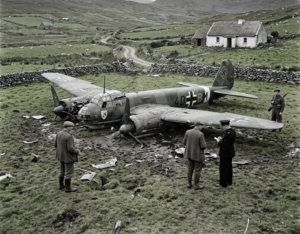 I was fascinated this week to learn of the German war plane that crash landed in Mastergeehy on St. Stephen’s Day in 1941. There is an article about it in this week’s Kerryman, but unfortunately, that’s behind a paywall online. The Germans who crashed did not find themselves amongst a hostile local population. Quite the opposite, they were so welcomed, they were celebrated in song. Thanks once again to the fountain of all things local history Tom Horgan, and the excellent resource that is binneas.ie.